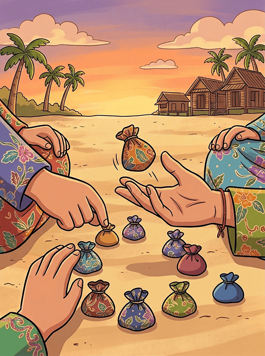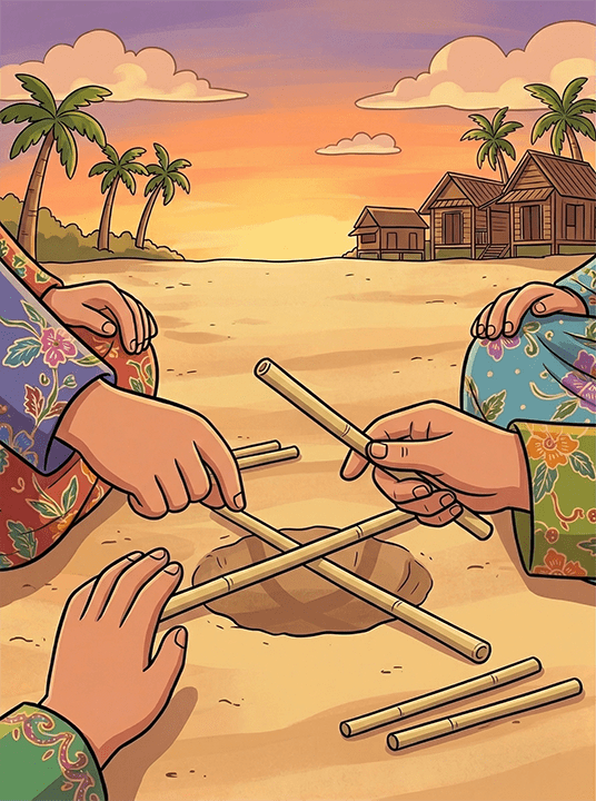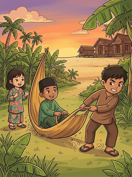 Cara bermain: Mengggunakan daun pelepah pokok pinang atau upih pinang yang luruh, seorang pemain akan duduk di atas pelepah, manakala seorang lagi akan menariknya. Yang duduk pastinya seronok merasa tiupan angin, tetapi yang menariknya pula, pasti tidak sabar menunggu saat gilirannya ditarik pula!