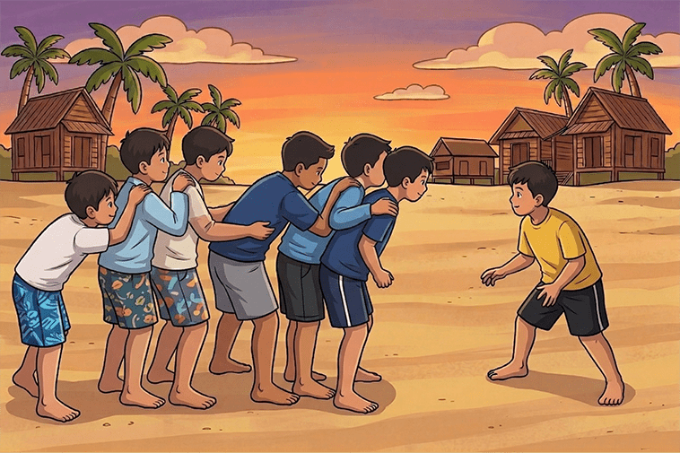Cara bermain: Satu permainan yang dimainkan di luar rumah atau di tapak yang terbuka. Pemain akan dibahagikan kepada dua kumpulan, satu kumpulan perlu menjadi benteng pertahanan dan satu lagi kumpulan perlu melepasi halangan ini untuk pergi ke kawasan yang paling hujung.