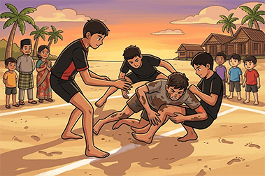 Cara bermain: Dimainkan oleh dua pasukan yang terdiri daripada tujuh orang pemain sepasukan. Pemain serangan yang dipanggil Raider akan masuk ke dalam bahagian gelanggang lawan dan cuba menyentuh seberapa banyak pemain lawan. Raider itu kemudian harus pulang ke ‘rumah’ tanpa dapat ditangkap oleh pemain lawan. Menariknya, ketika Raider cuba menyerang, dia mesti terus mengulang kata ‘Kabbadi’ tanpa putus. Andai kata ia terputus sebab habis nafas, Raider itu dikira tersingkir daripada permainan. Di Bangladesh, ia diangkat sebagai sukan bertaraf kebangsaan.